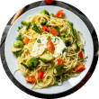 Pasta, mixed vegetables (zucchini, tomatoes, bell peppers), olive oil, garlic, Parmesan
